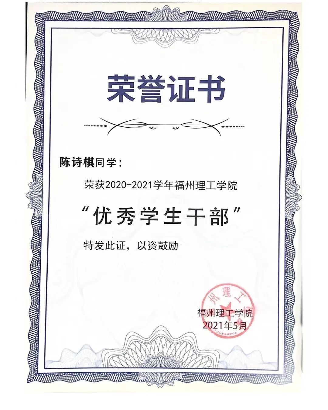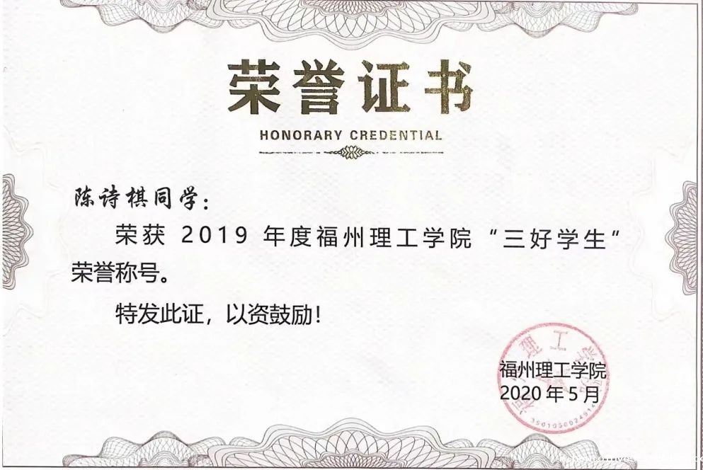 作为班级团支书的陈诗棋同学,尽心尽力协助辅导员处理班级各项事务,在工作中始终保持严谨认真的工作态度,脚踏实地,认真完成本职工作。任职期间,她严格要求自己,对学院下达的各项任务积极配合,做好学校与学生之间上传下达的工作。曾带领班级获得应用科学与工程学院2019-2020年度“荣光七十载,公益暖人心”团日活动 “二等奖”、2020-2021年度“薪火相传话青年,防疫战争我先行”团日活动“三等奖”、2019-2020年度“五四红旗团支部”、2020-2021年度“优秀班级”荣誉称号。积极带领同学们投身公益事业中,以班级名义向留守儿童捐款使班级获得“公益大使”称号。