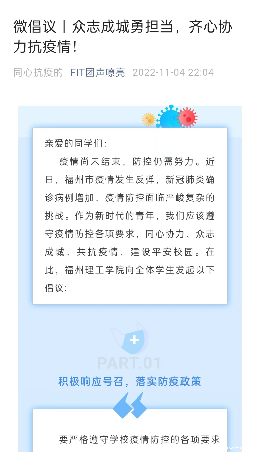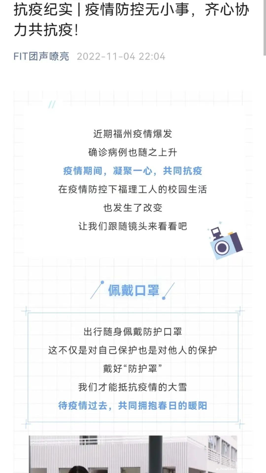福州疫情发生以来,校团委坚守思想宣传主阵地,充分利用团属新媒体矩阵主动发声,开展及时、准确、正面的宣传引导,引导青年学生遵守疫情防控规定,养成良好卫生习惯,同舟共济做好疫情防控工作。