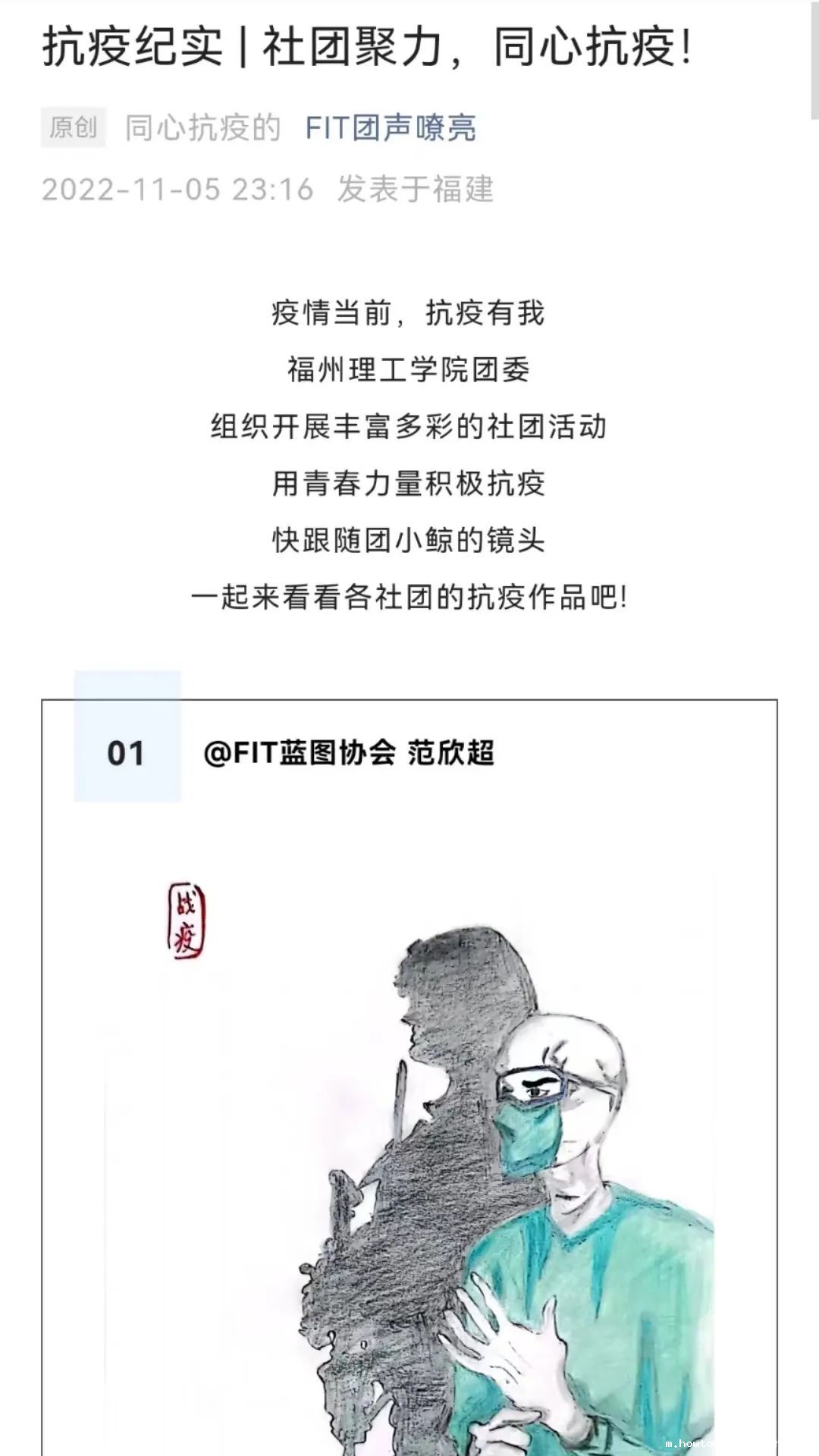 为充实学校静默管理期间的校园文化生活,校团委积极开展“情牵福理工共抗疫,书写明信片送祝福”明信片征集活动、“学思践悟,砥砺奋进”中英双语学习活动、“2022年秋季‘云’运动会”活动、“社团聚力,同心抗疫”作品征集活动等,参与人次达6000余人次。创作了一批绘画、书法、诗歌、短视频等形式多样的艺术作品,齐心抗疫,凝聚力量。
